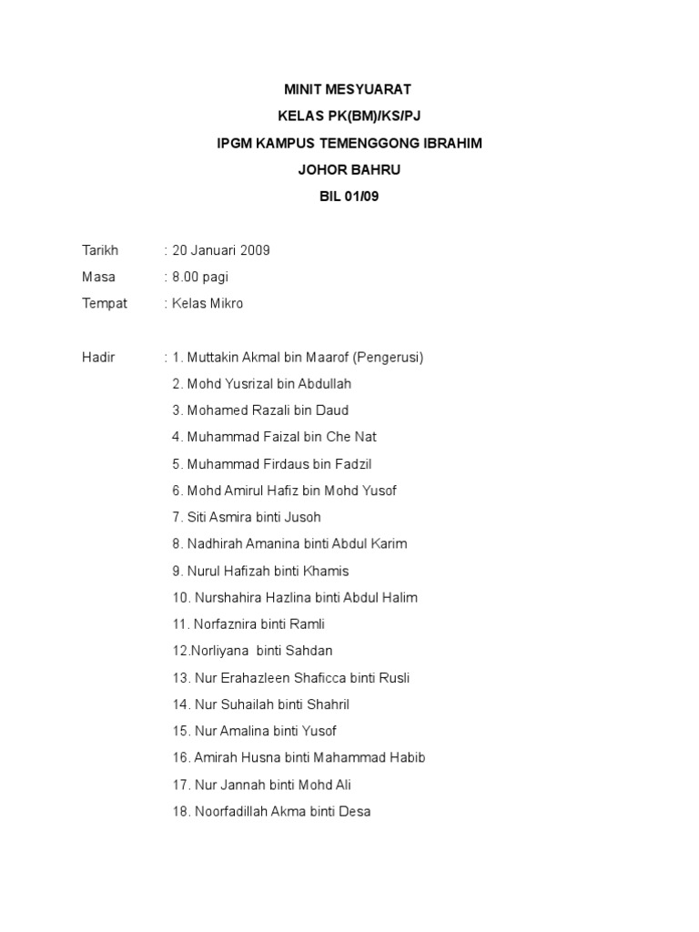 Minit Mesyuarat Bahasa Melayu Kali Ketiga. Contoh minit mesyuarat syarikat kali pertama. Minit mesyuarat atau minutes of meeting mom adalah penting dalam sesebuah mesyuarat kerana ia akan menjadi panduan.
